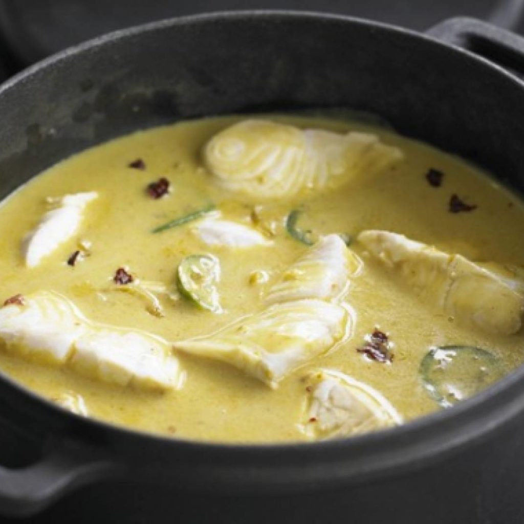 Chauffer l’huile dans une cocotte. Faire fondre les oignons émincés 2 à 3 minutes. Saupoudrer de curry. Mélanger puis verser le lait de coco. Laisser frémir 5 minutes. Ajouter le piment épépiné et émincé puis les morceaux de merlan égouttés.
