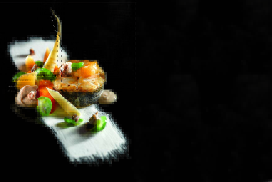 Arroser les darnes avec la cuisson. Les disposer au centre droit de l’assiette, mettre un beau point de sauce à côté, puis quelques points aux extrémités de l’assiette. Ajouter les légumes, les éclats de châtaignes et les mandarines harmonieusement.
